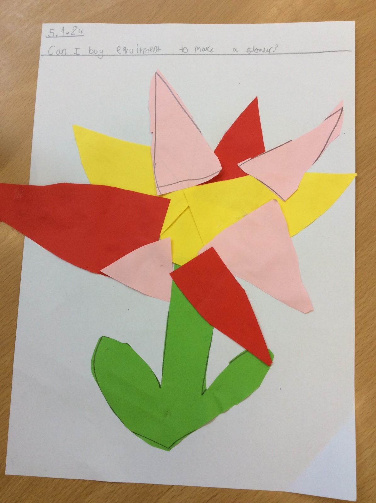 The children looked at the coins that make up our monetary system and were then set the challenge of making a flower from different coloured papers. The challenge being that they only had a small amount of money in their group and a few resources to sell to other groups. They learnt about buying items, having enough money to buy items and about giving change.