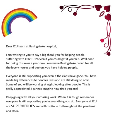 Having heard a little about what it might be like to work in Intensive Care Units during this COVID-19 pandemic, our Year 5 pupils decided to write letters of thanks and encouragement to the people working there. Please see our photo gallery for more examples
